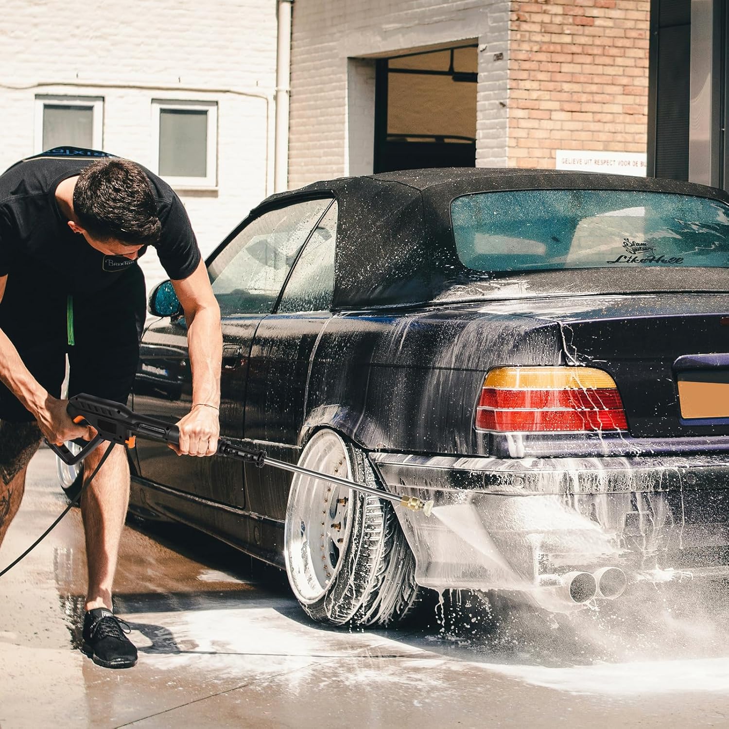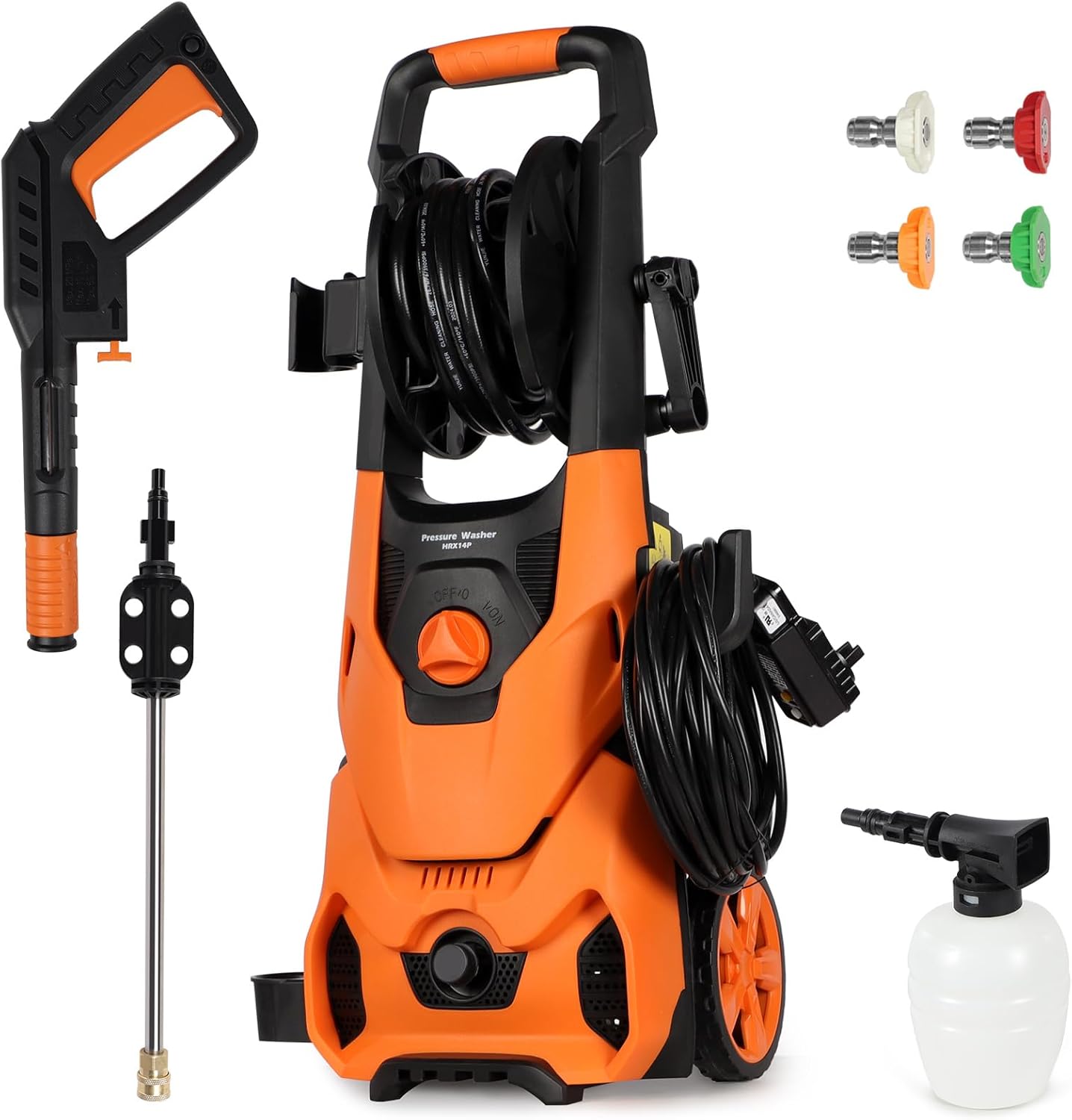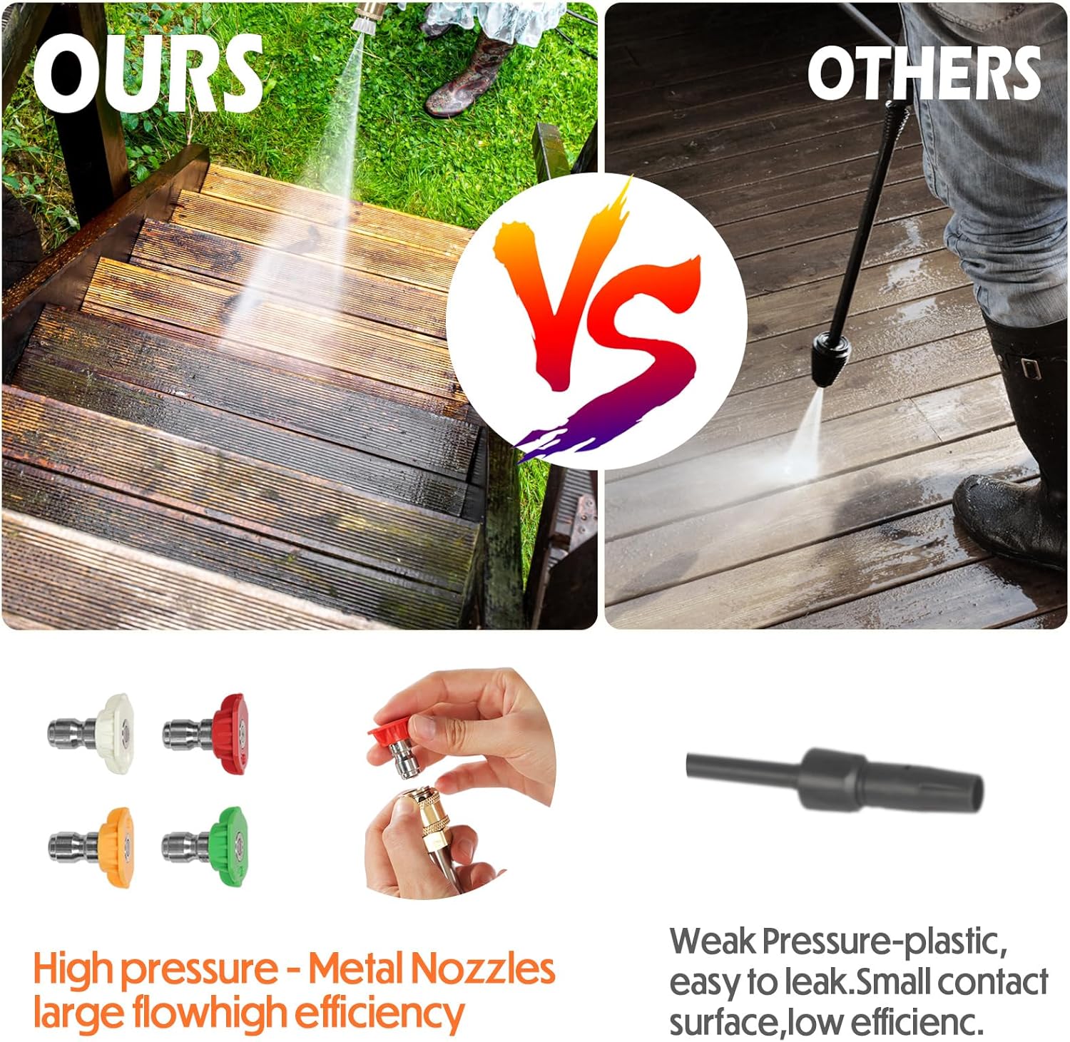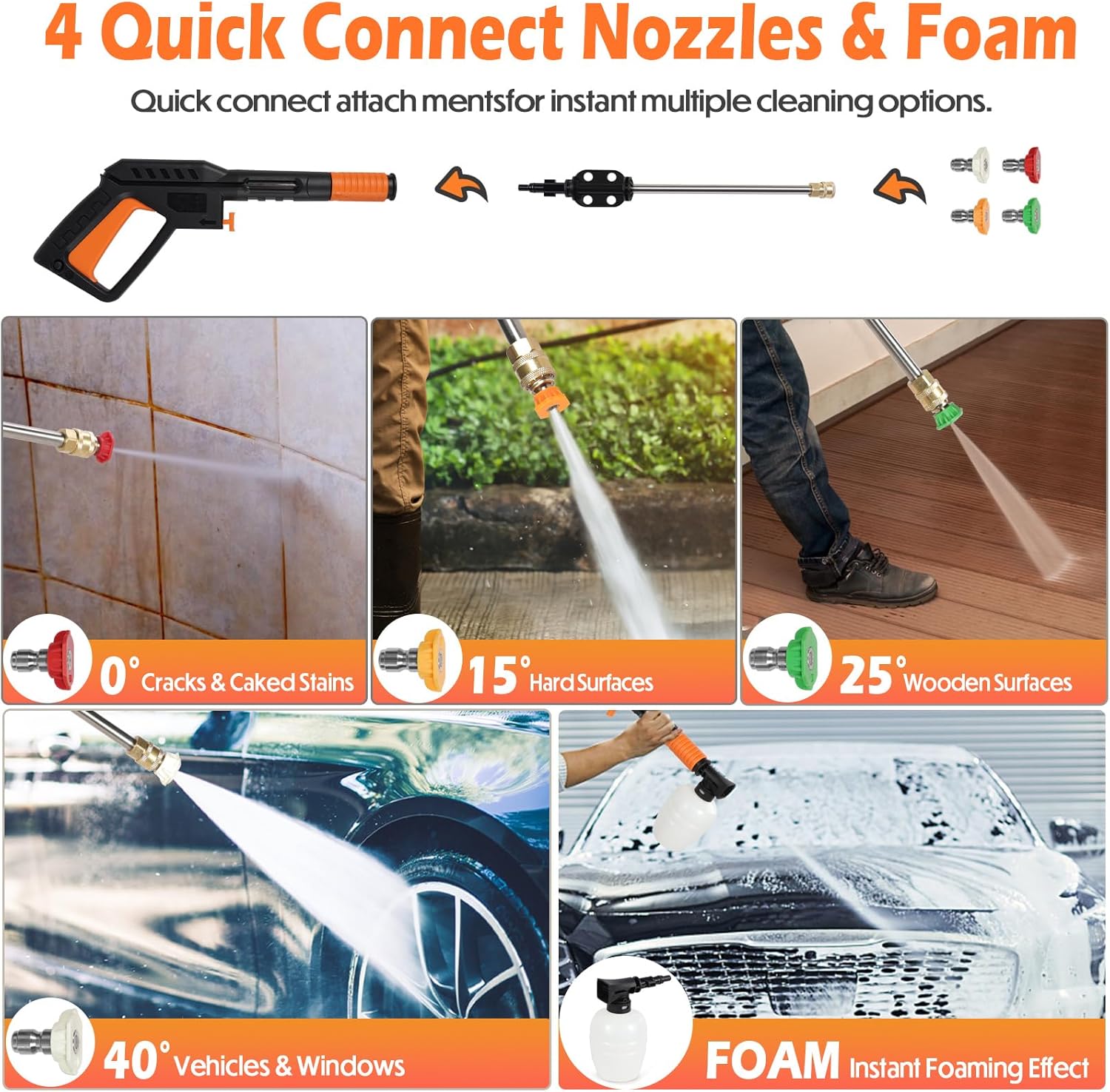 - 5 Nozzle Options ---This pressure washer has 4 quick-connect spray tips (0º, 15º, 25º, 40º soap nozzle ), which let you do any tough cleaning jobs. The 250ml detergent bottle allows you to wash your car or patio with rich bubbles, giving you much better cleanliness.