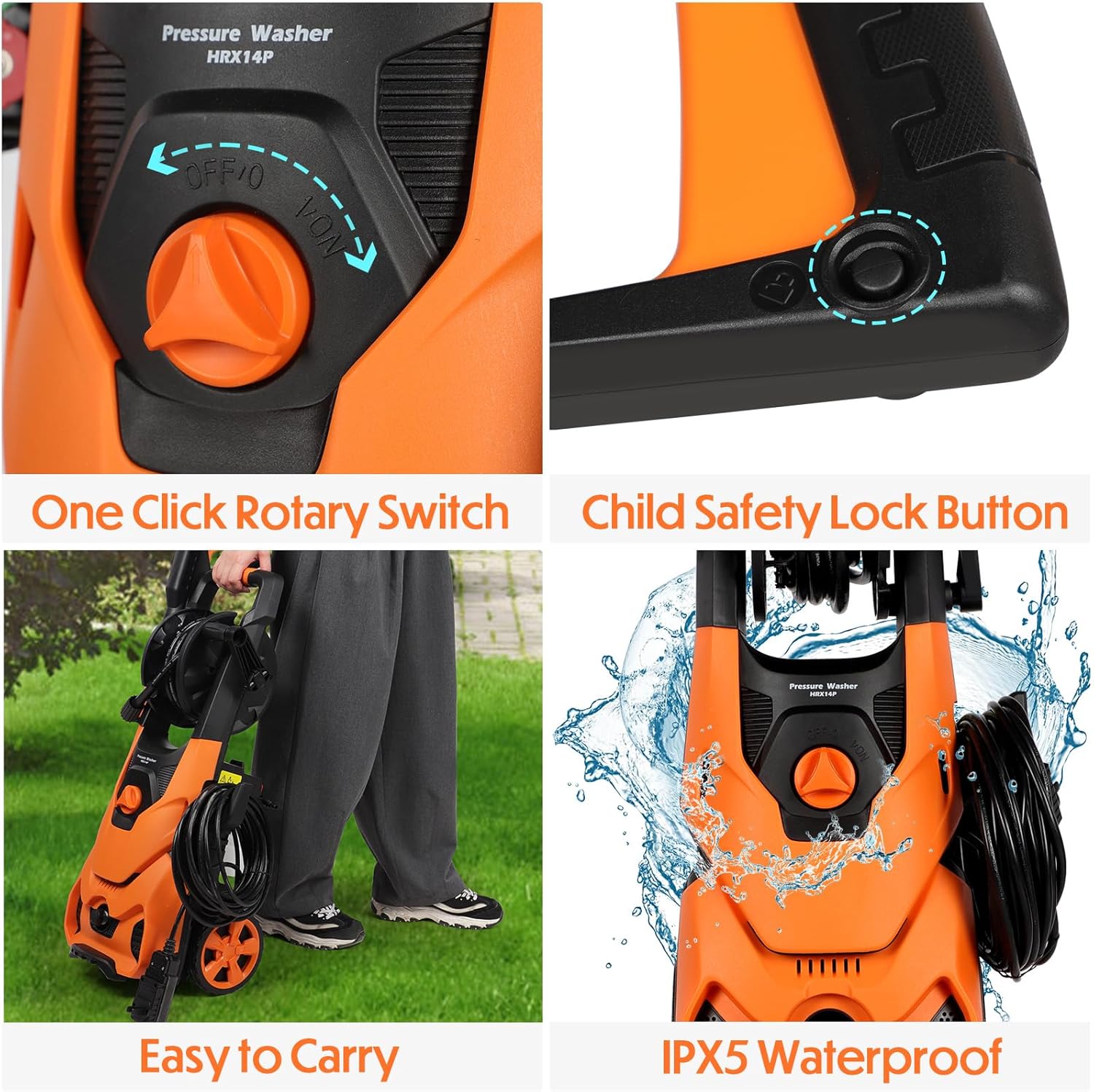 - TSS &Safety Lock---Electric washer machine is equipped with Total Stop System which automatically shuts off the pump and power when the trigger is not engaged to save energy and prolong pump life.This pressure washer features a safety lock switch that enables the spray gun to be safely locked, preventing any accidental start up.